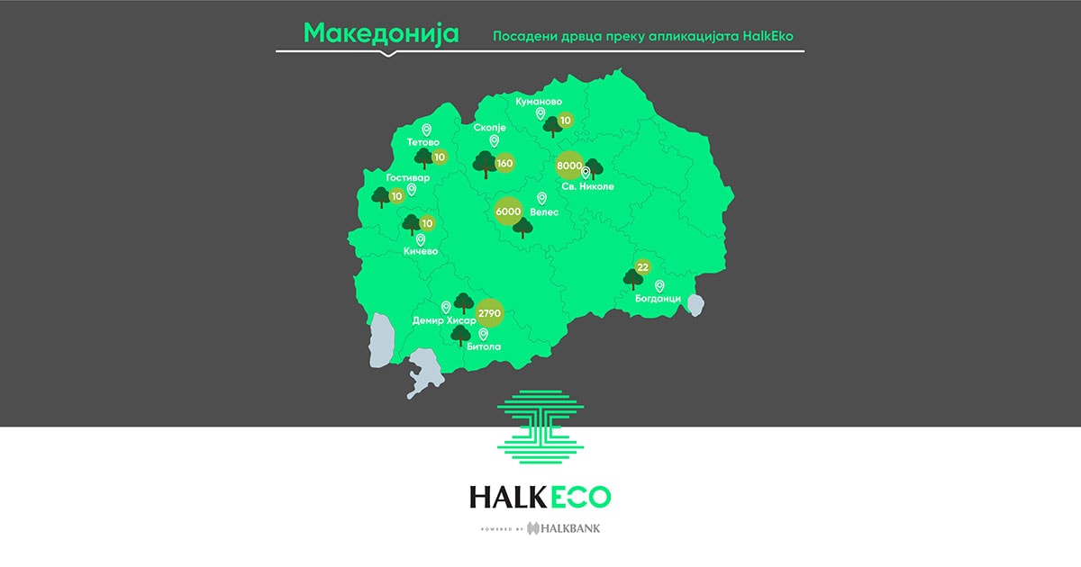 Во склоп со својата иницијатива за зачувување на животната средина и подигање на еколошката свест, платформата HalkEco, Халкбанк АД Скопје достигна број од 17.000 засадени дрвjа во периодот од стартување на еко платформата, од октомври минатата година до денес.