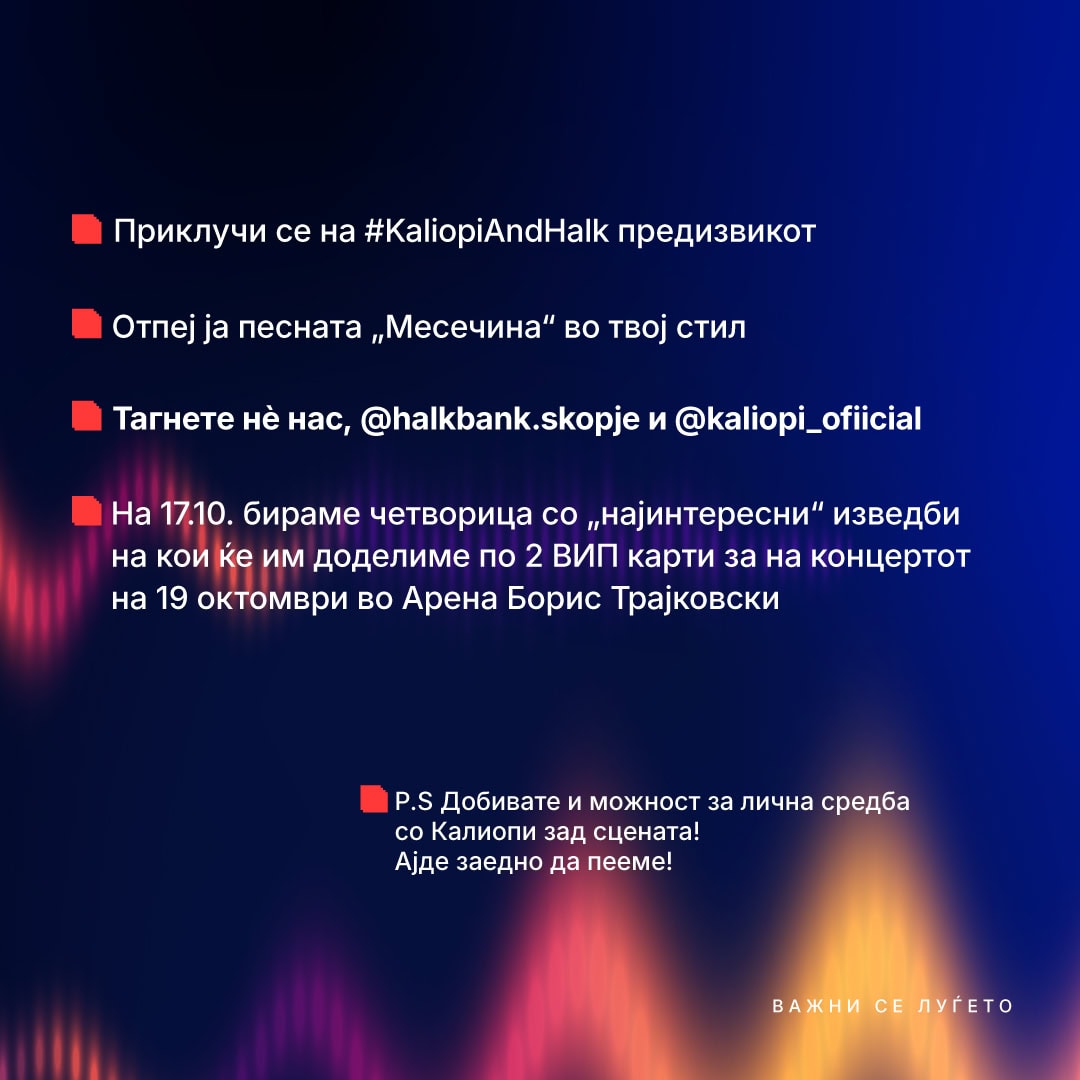 Во рамките на ваквата поддршка, оваа есен, банката е спонзор на концертот на музичката дива Калиопи, кој ќе се одржи на 19 октомври во Арена Борис Трајковски. За вљубениците во музиката и во прекрасниот вокал на Калиопи, Халкбанк во пресрет на концертот, организира интересен предизвик кој дава шанса да се освојат ВИП карти за концертот и лична средба со Калиопи зад сцената.