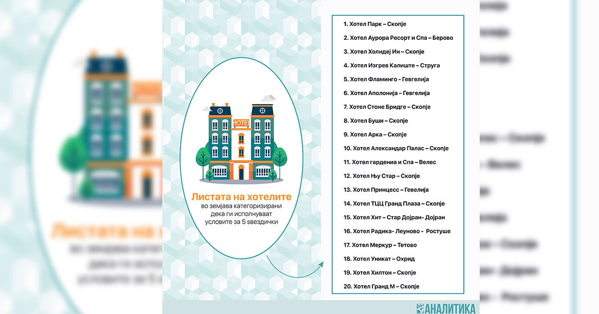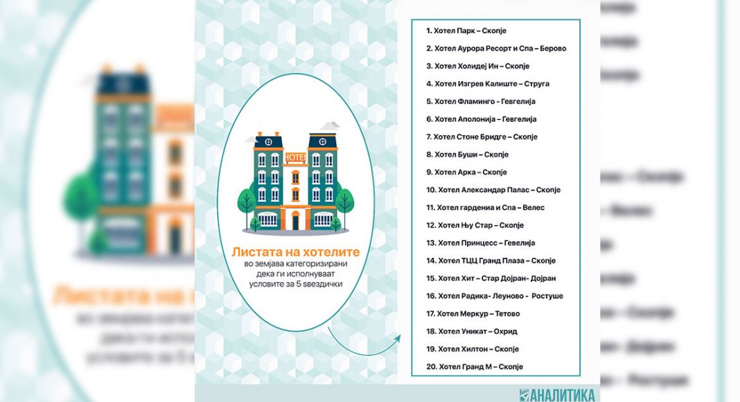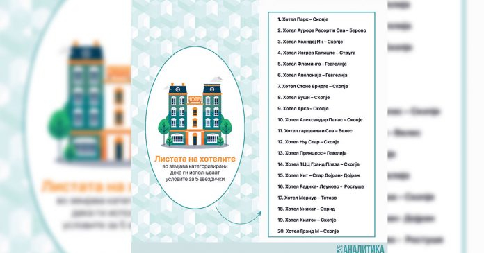 „Аналитика“ веќе објави дека според последната категоризација на Министерството за економија во земјава има категоризирано 197 хотели, од кои 20 хотели се со 5 ѕвезди. Но кој ги дава ѕвездите на хотелите и има ли простор за субјективни оценки?! Од Министерството за економија велат нема простор за субјективизам – посебна комисија од 13 члена од разни институии ја прави оценката која има фотографски документиран материјал, а крајниот „амин“ го дава Владата.