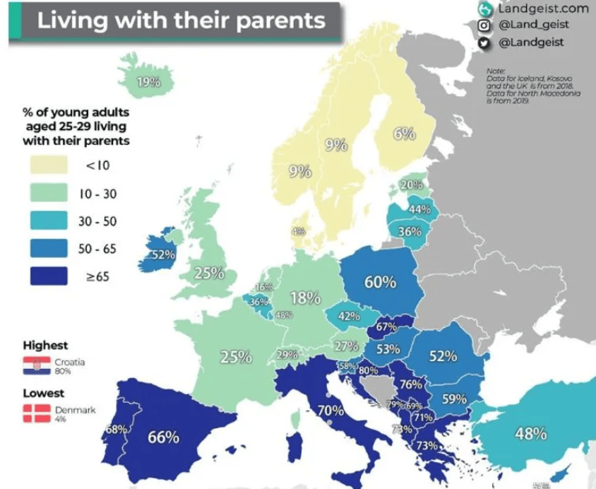 Според една друга статистичка карта, објавена на крајот на 2022 на истава тема, кога се мереше колкав процент од младото население се уште живее со родителите од сите европски земји, Хрватска повторно се најде на самиот врв повторно на самиот врв. Оваа статистика покажа дека дури 80% од младите до навршени 30 години остануваат да живеат со родителите, додека во соседна Унгарија 53% од младите живеат со своите родители, а во Словенија 58%. Србија има нешто помал процент од Хрватска – 76%, додека Црна Гора е подобра од Хрватска за само еден процентен поен, таму младите до 30 години живеат во процент од 79%. Македонија на оваа карта е, исто така високо позиционирана – 71% од нејзината младина живее со родителите до навршена 30 година.