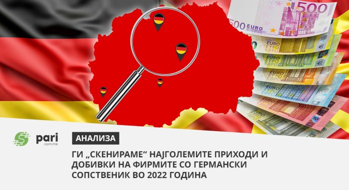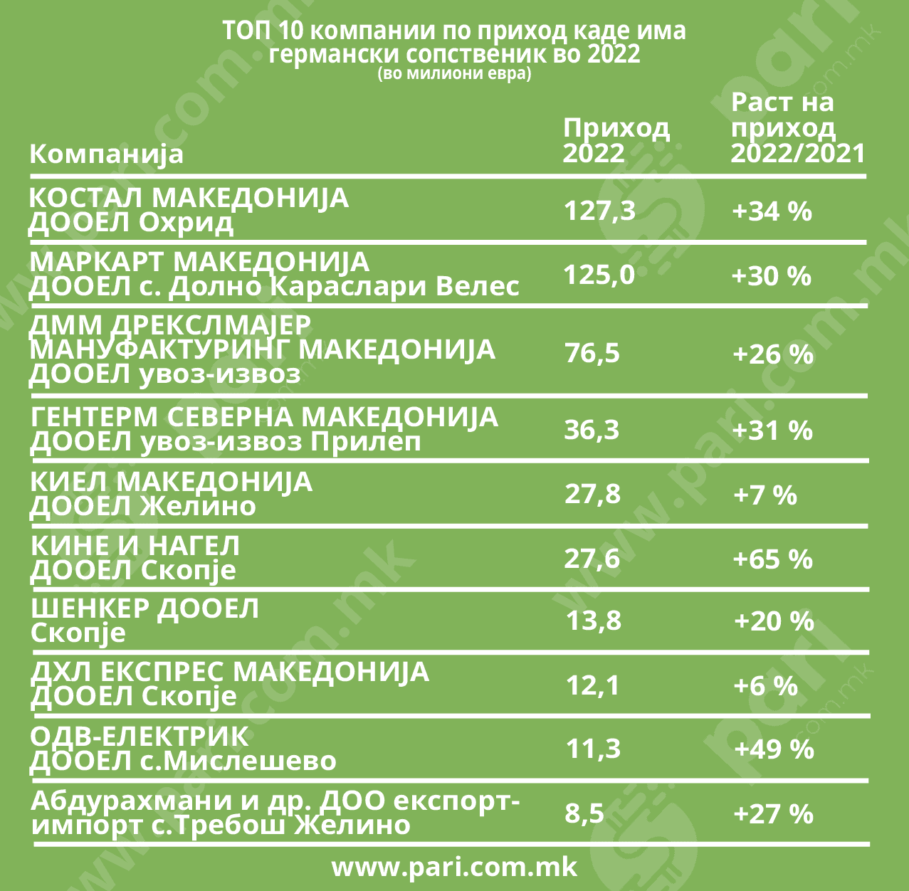 Десетте најголеми компании по приход во кои има германски сопственик (може во сопственоста да има и друг сопственик, од друга земја или од Македонија) во 2022 година направиле приход од 466 милиони евра.