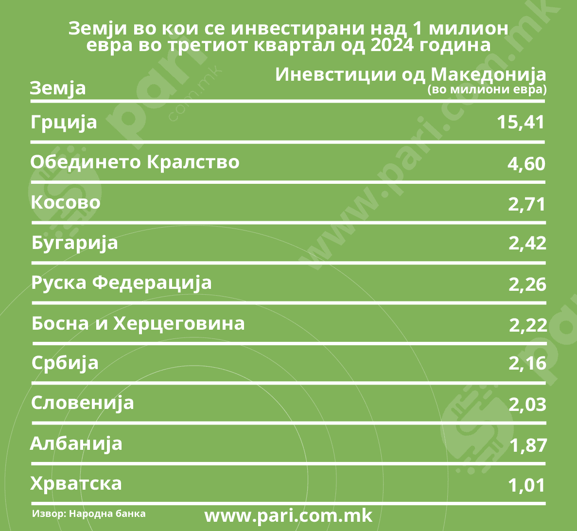 Земји во кои се инвестирани над 1 милион евра во третиот квартал од 2024 година