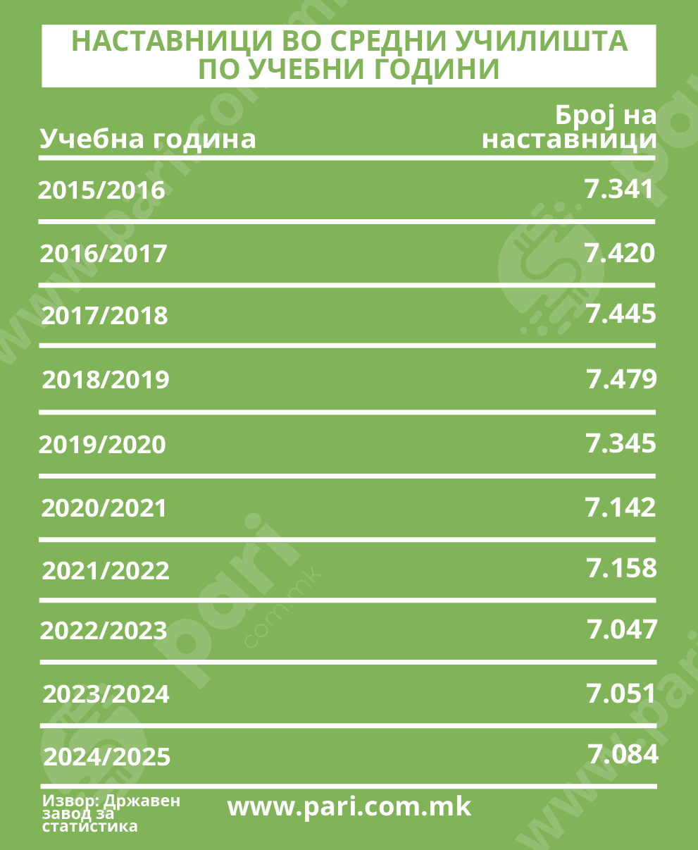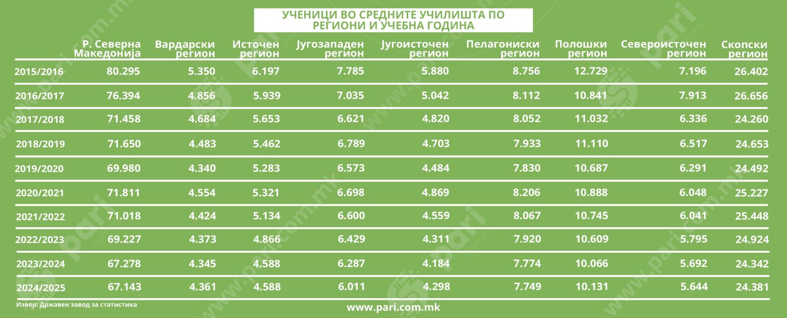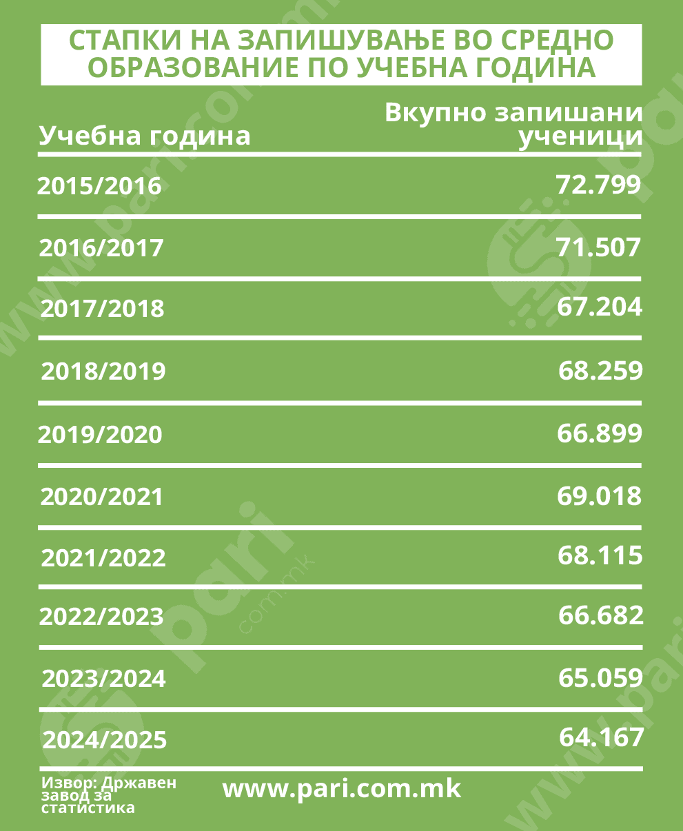 Сепак, не е сѐ како што треба. Во средношколските клупи, исто како и во основните училишта, има сѐ помалку ученици. Со темпо – секоја година едно училиште помалку. Во периодот од една деценија се создала празнина, која инаку би требало да биде пополнета со 8.632 млади лица. Сликовито може да се опише – небаре заминале сите жители од Јегуновце. Толкава е разликата од запишаните 72.799 во учебната 2015/2016 година до тие 64.167 ученици во учебната 2024/2025 година. Податоците што ги анализира Пари се од базата Макстат на Државниот завод за статистика.