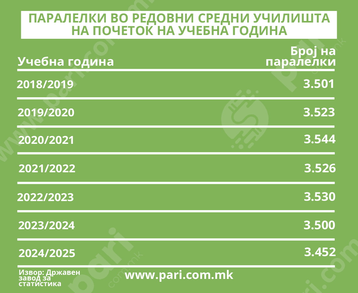 Во базата Макстат, во однос на паралелките, достапни се податоци од учебната 2018/2019 година. Тогаш имало 3.501, а во 2024/2025 година биле 3.452. Притоа, падот и растот речиси се наизменични во текот на тој период. Разликата од 49 паралелки не соодветствува со состојбата кај средношколците.