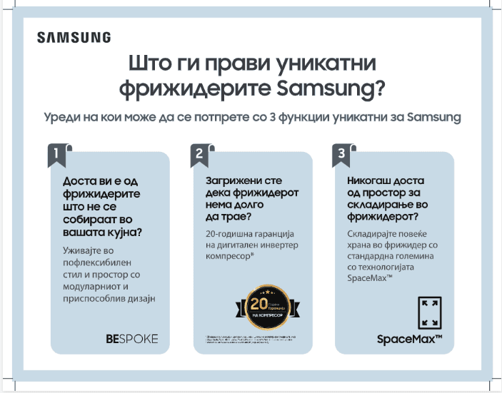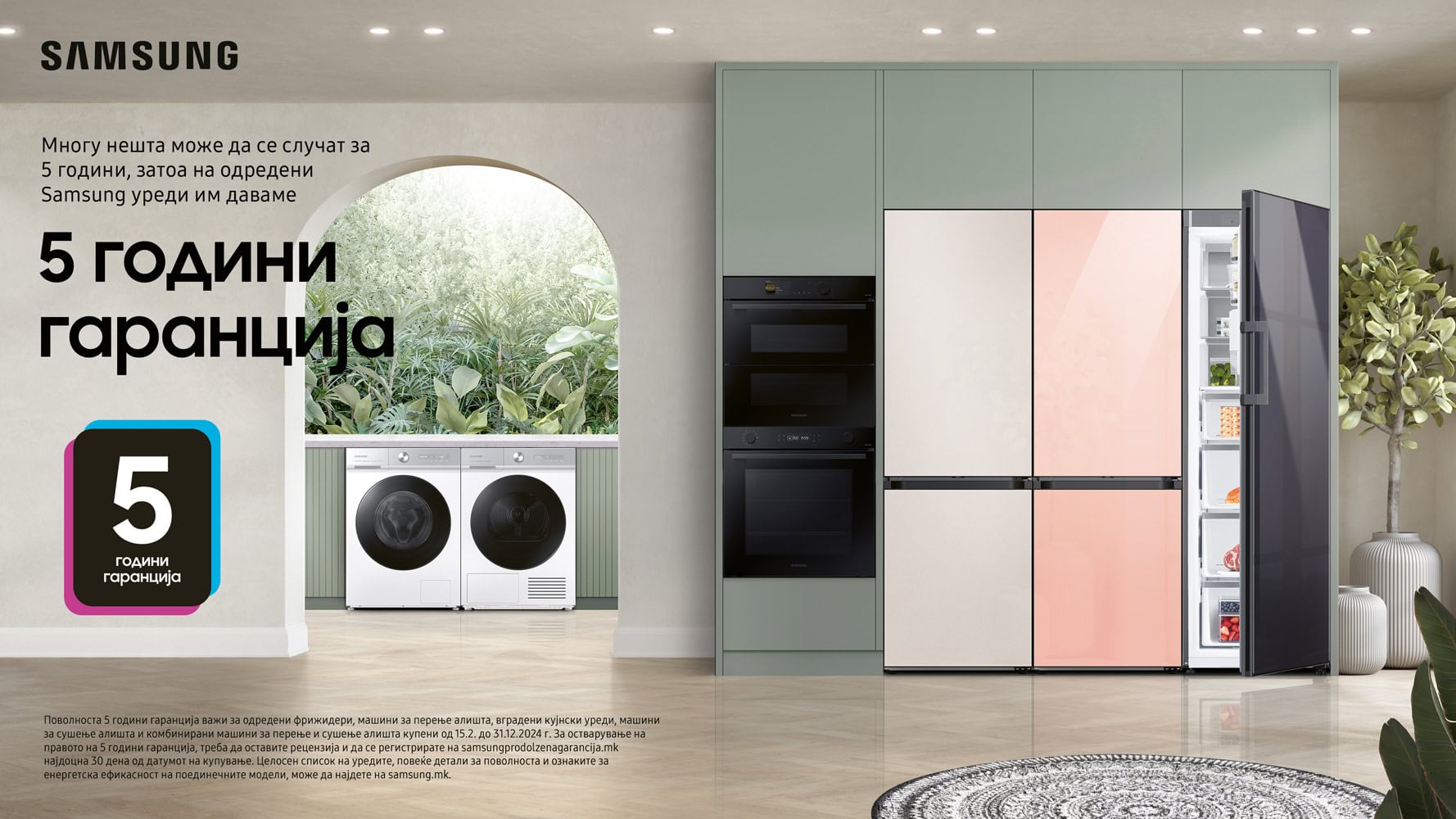 Samsung за своите верни потрошувачи ја продолжи гаранцијата на одредени арати за домаќинство од 2 години на 5, вклучувајќи тука дополнителни 3 години комерцијална продолжена гаранција. Повеќе за оваа понуда и за тоа кои производи ги опфаќа, прочитајте тука.