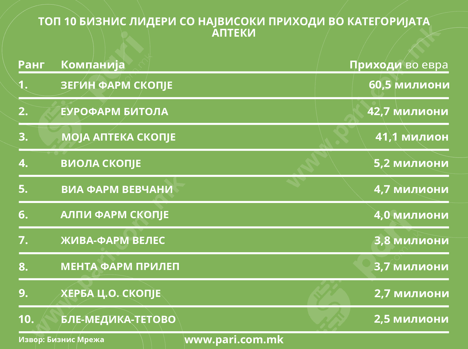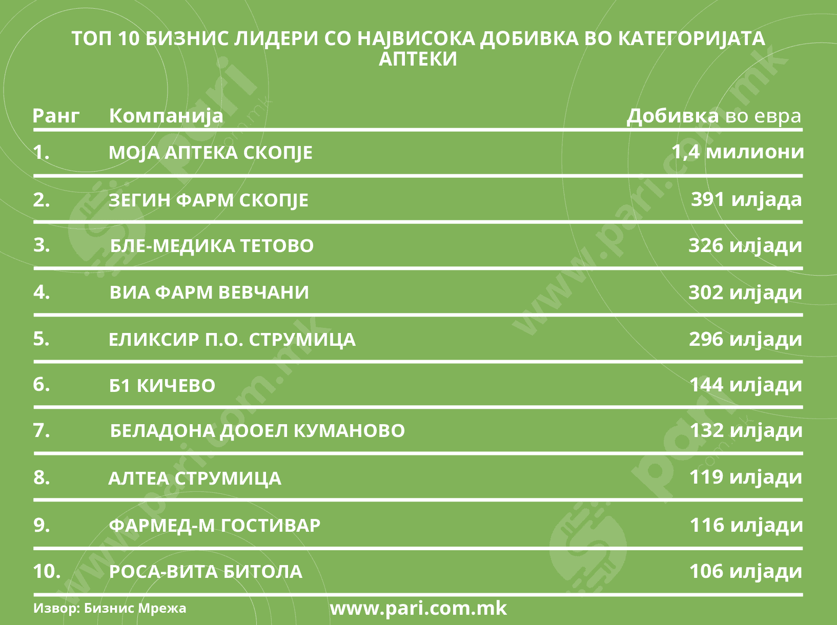 Пари, користејќи ги податоците од БизнисМрежа, пресмета дека вкупниот приход на топ 10 аптеки, изразен во домашната валута, изнесува точно 10.545.436.237 денари. Тоа е респектибилна сума, која укажува на значителна активност и е одраз на побарувачката во доменот на фармацевтските производи.