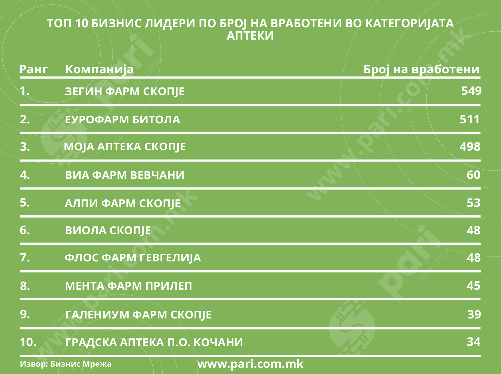 Во три од десетте компании егзистенцијата ја обезбедуваат 82,65 насто од вработените. Или, од вкупно 1.885 работно ангажирани, 1.558 лица платата ја заработуваат во Зегин, Еурофарм или Моја аптека. Во останатите седум аптеки има 327 вработени.