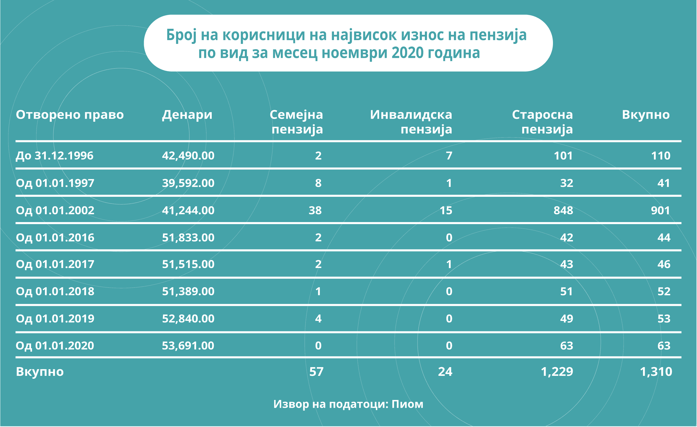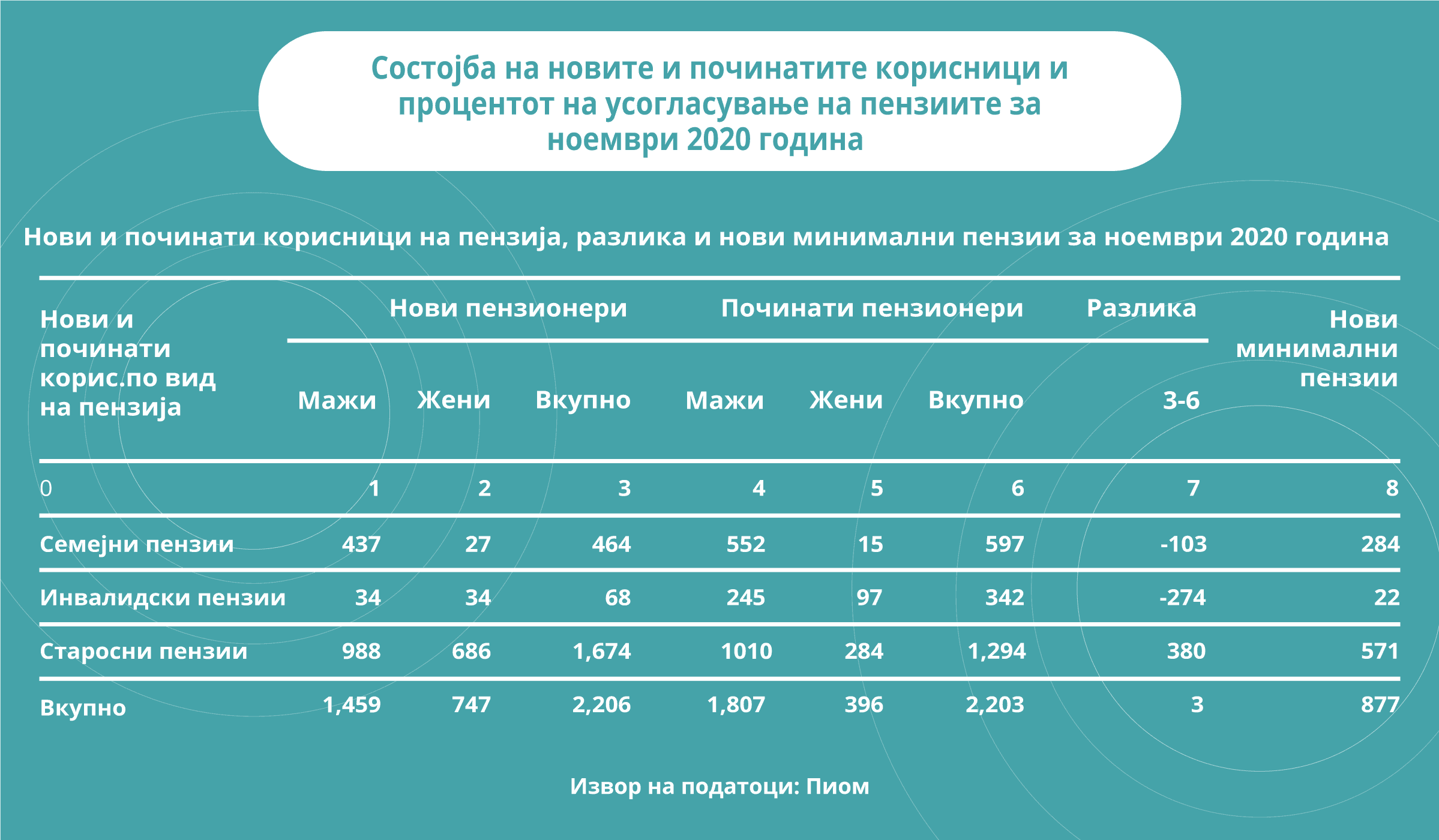 Само во месец ноември имало нови 2.206 пензионери на списокот на ПИОМ. Од нив најголем дел биле мажи 1.459 а остатокот жени и најголем дел, 1.674 се стекнале со правото на старосна пензија. Од друга страна пак, имало 2.203 починати пензионери, од кои 1807 биле мажи.