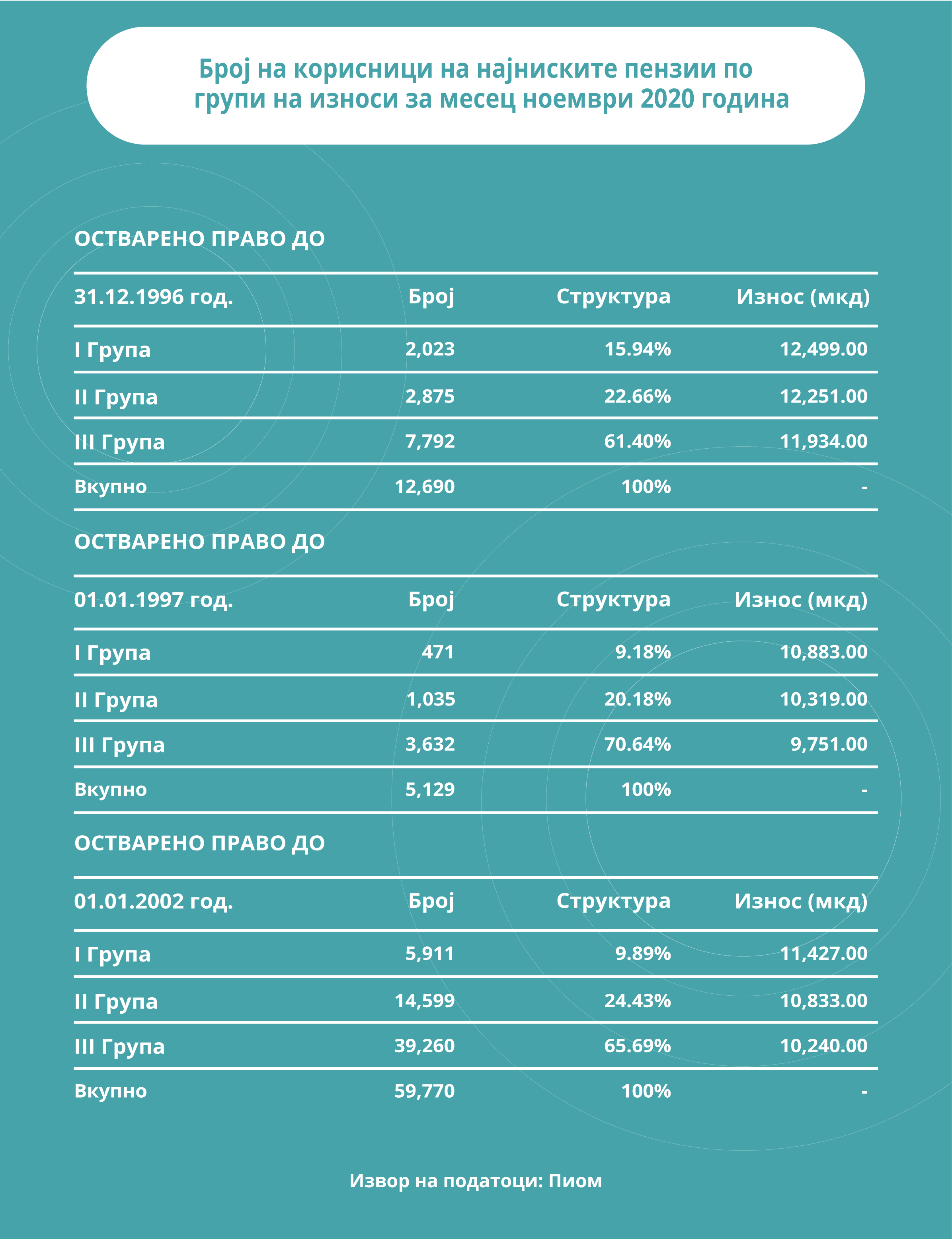 Најнизок износ на пензија земале 77.589 пензионери, од кои 59.770 пензионери за остварено право од 01.01.2002 година до денешен датум. Останатите 17.819 се за оставрено право до 1996 и за периодот 1997 – 2002 година. Најнискиот износ на пензија за најголемата група на корисници на ова право се движи од 10.240 денари до 11.427 денари, во зависност од групата на која што припаѓаат.