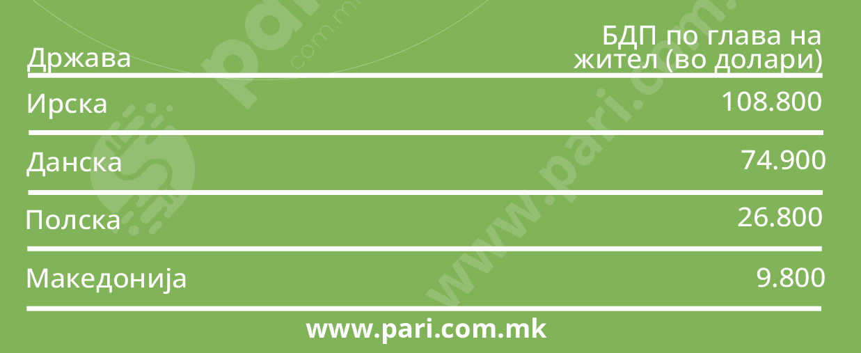 Според подтоците од Меѓународниот монетарен фонд ( https://www.imf.org/external/datamapper/NGDPDPC@WEO/UVK/EURO/EU) за проценетиот бруто домашен производ по глава на жител по сегашни цени, Полска има 26.800 долари БДП по жител, Данска има 74.900 долари, Ирска 108.800 , додека Македонија има 9.800 долари БДП по жител.