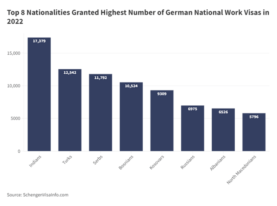 Од сите националности, податоците покажуваат дека на Индијците им бил издаден најголем број работни визи од Германија во 2022 година или вкупно 17.379 работни визи, при што повеќето од нив, 8.613 работни визи, биле доделени од Генералниот конзулат на Германија во Бангалор. Турските државјани се втори по големина корисници на работни визи издадени од Германија. Минатата година на вкупно 12.542 државјани на Турција им била издадена работна виза.