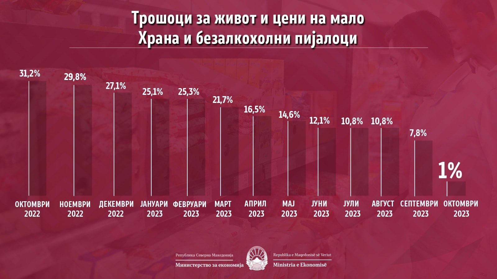 Трошоците за живот во делот на храна и безалкохолни пијалоци во октомври бележат раст од 1%, што е драстично намалување споредено со 7,8% пресметани во претходниот месец.