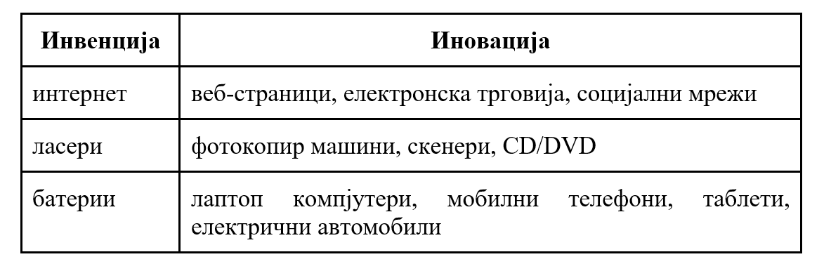 Како примери за иновација и инвенција може да се наведат: