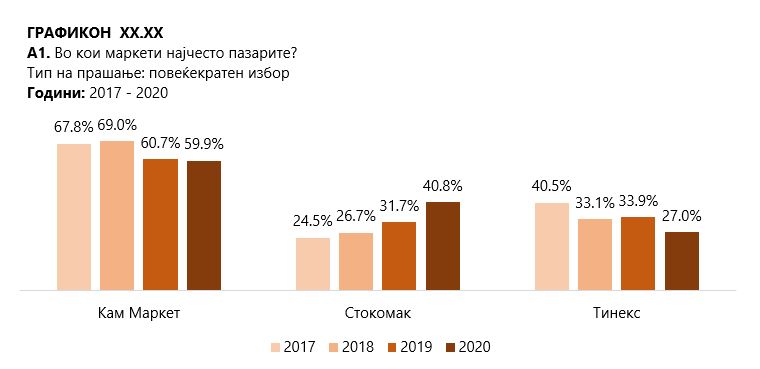 Според Македонските потрошувачите и одговорите на прашањето Во кои маркети најчесто пазарите? на првата позиција во 2020-та година го избираат КАМ Маркет со идентично учество како и претходната од 60%. На втората позиција после три години се искачува Стокомак со 40% учество пред Тинекс со 27%.
