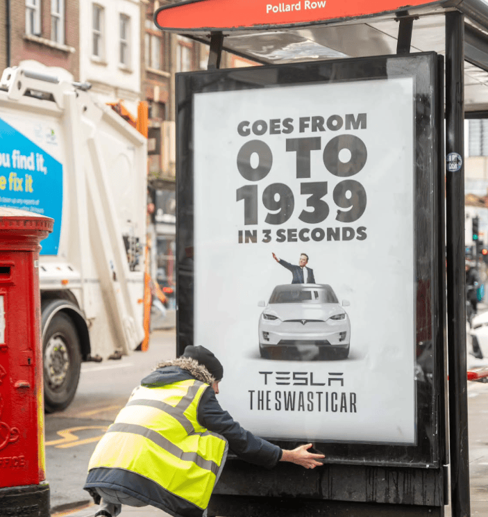Постерот, се појави во Бетнал Грин, Лондон и ги повикува луѓето да не купуваат автомобили Тесла за кои Маск е извршен директор со слоганот: „Оди од 0 до 1939 година за 3 секунди“.