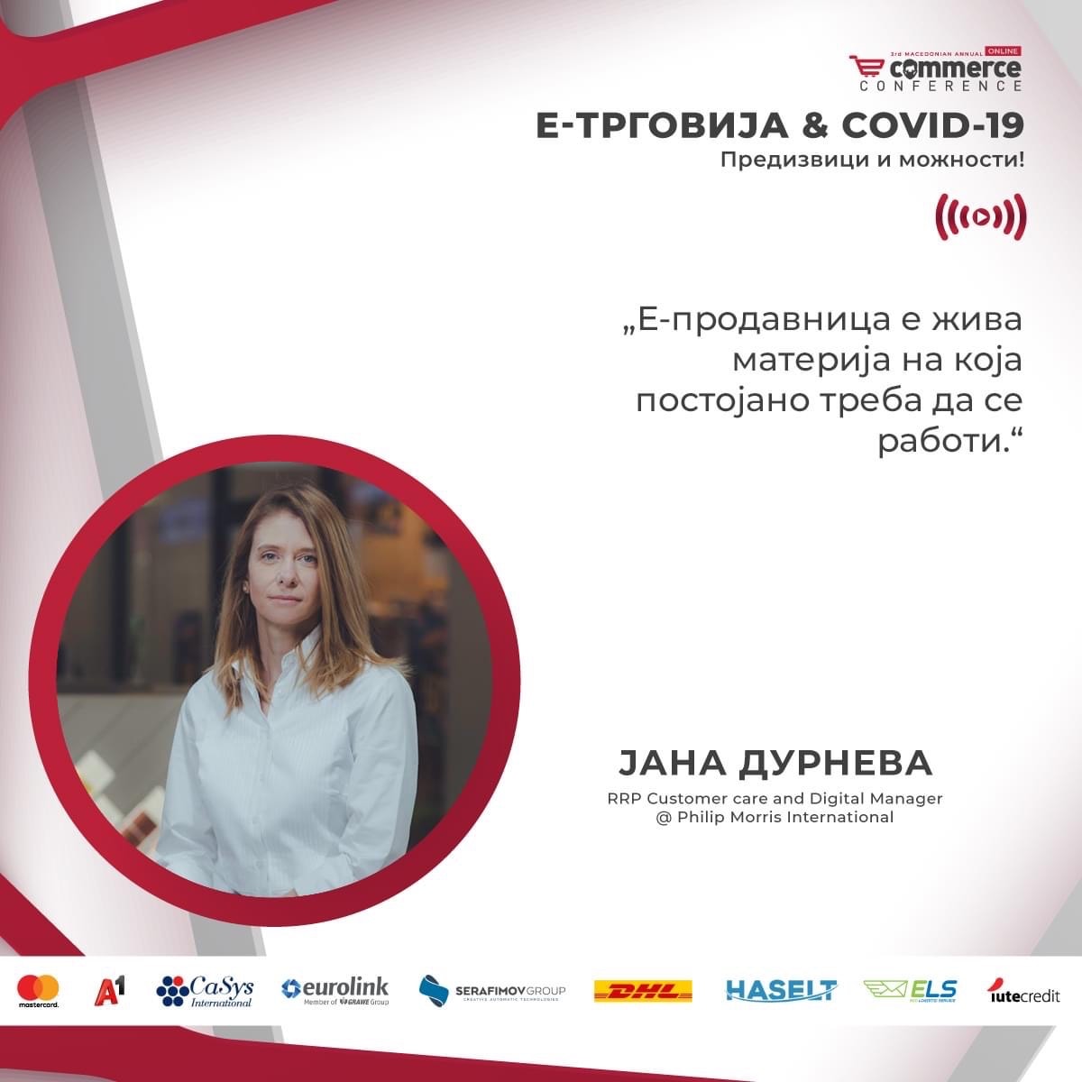 Нашиот иницијален план беше да се лансира IQOS на нашиот пазар во почетокот на април, но како ситуацијата со пандемијата стануваше сé посериозна, увидовме дека пандемијата наметна многу побрзо привикнување на корисниците на дигиталните канали, со што стана јасно дека мора да се искористи времето од одложениот старт за да се подготви е-продавница и така со лансирањето на IQOS се започна и со онлајн продажба“. Ова го истакна Јана Дурнева, менаџер за дигитална поддршка и грижа за корисници на производи со намален ризик при Филип Морис Интернешнал на овогодинешната конференција за е-трговија, насловена „E-трговија & COVID-19: Предизвиците и можностите!“. Таа на учесниците на конференцијата го пренесе искуството од брзото прилагодување на новонастанатата ситуација со пандемијата која целосно ги промени сите планови за лансирање на IQOS, долгоочекуваниот електронски уред со несогорлив тутун и на македонскиот пазар.