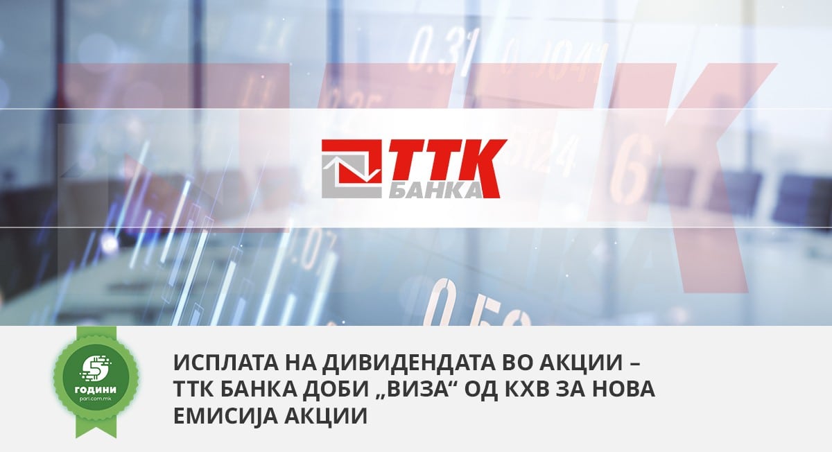 „Комисијата за хартии од вредност донесе Решение со кое на ТТК банка АД Скопје и се дава одобрение за издавање на долгорочни хартии од вредност по пат на приватна понуда – четврта емисија на акции. Со четвртата емисија на акции ТТК банка АД Скопје ќе издаде 67.587 обични акции со номинална вредност од 1.000 денари по акција и со вкупна вредност на новоиздадените акции од 67.587.000 денари“, се вели во информацијата од КХВ.