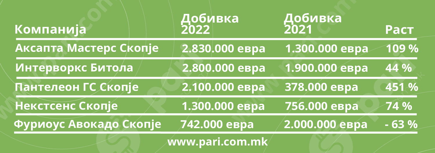 Затоа, меѓу компаниите со најголеми профити е на средина, на третата позиција, со 2,1 милион евра. И во овој поглед е соборен рекорд. Пантелеон ГС е убедливо прв со растот од огромни 451 процент, во однос на 2021, кога добивката била 378 илјади евра.