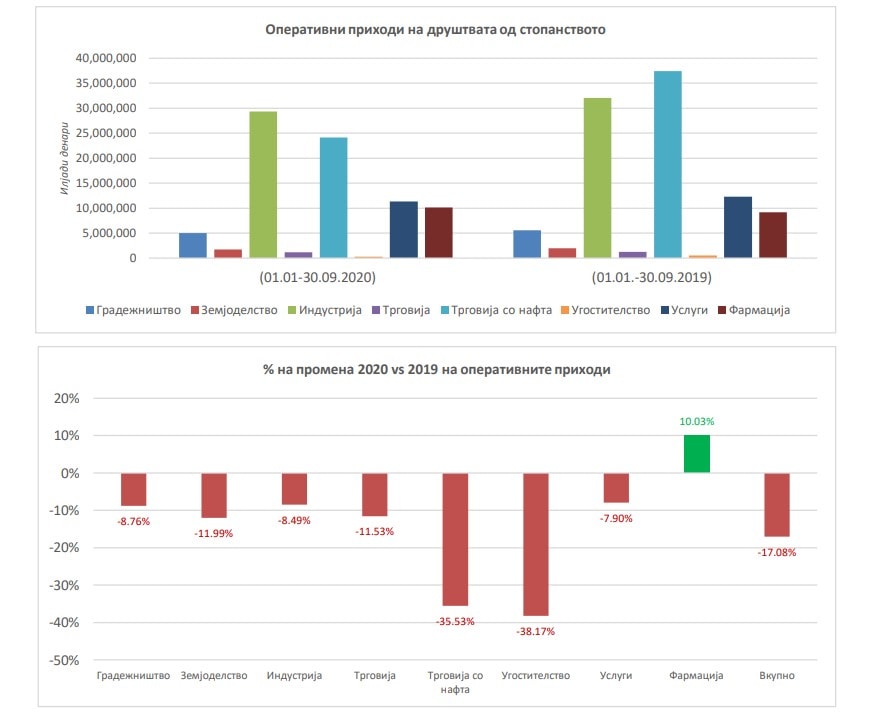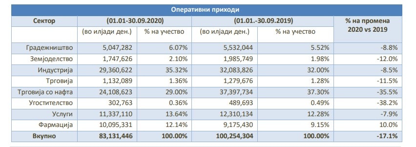 Гледано по сектори, најголемо учество во вкупно остварените оперативни приходи од друштвата од стопанството во првите девет месеци од 2020 година имаат друштвата од секторот индустрија (35,32%), по што следат друштвата од секторот трговија со нафта (29%), услуги (13,64%) и фармација (12,14). При тоа, пораст на остварените оперативни приходи во првите девет месеци од 2020 година во споредба со истиот период минатата година е забележан само во секторот фармација, додека сите други сектори бележат намалување на остварените оперативни приходи.