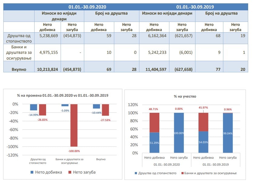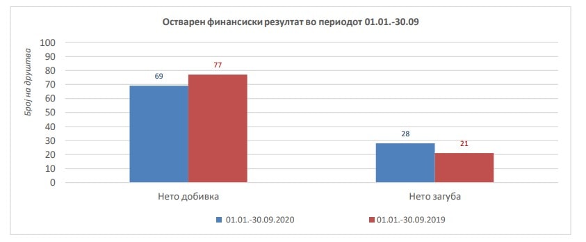 Од објавените 97 деветмесечни биланси на успех се констатира дека 69 друштва периодот 01.01.-30.09.2020 година го завршиле со позитивен финансиски резултат – нето добивка, а 28 друштва деветмесечниот период го завршиле со негативен финансиски резултат – нето загуба.
