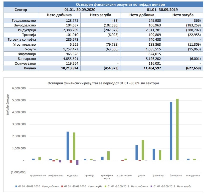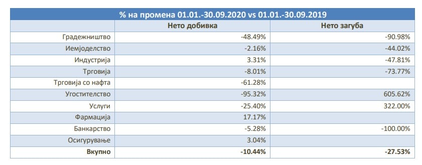 Најголем пад на износот на нето добивките има кај друштвата од секторот угостителство за 95,32%, од секторот трговија со нафта за 61,28% и од секторот градежништво за 48,49%. Во поглед на искажаните нето загуби, друштвата од секторите угостителство и услуги бележат најголем пораст на искажаните износи на нето загуби за периодот од 01.01.- 30.09.2020 година во однос на истиот период од 2019 година, и тоа за 605,62% односно 322%, респективно. Учеството на износот на искажаните загуби од друштвата од секторот угостителство и од секторот услуги во вкупниот износ на остварени нето загуби од котираните друштва за периодот 01.01.-30.09.2020 година е 17,54% и 13,97% респективно, и истото бележи пораст во однос на учеството во вкупниот износ на остварени нето загуби од котираните друштва за истиот период минатата година кога изнесувало 1,80% и 2,40% респективно.