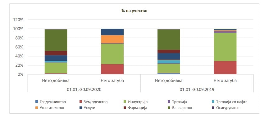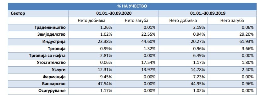 Најголем дел од вкупниот износ на остварените нето добивки во првите девет месеци од 2020 година, односно 47,54%, е остварен од осумте банки чии хартии од вредност котираат на Македонска берза АД Скопје. Покрај банките, значајно учество во вкупно остварениот износ на нето добивки во првото деветмесечие од годината имаат и секторите индустрија со 23,38%, услуги со 12,31% и фармација со 9,45% од вкупно остварениот износ на нето добивки, додека значајно помало е учеството на друштвата од останатите сектори во вкупно остварениот износ на нето добивки односно 2,81% од секторот трговија со нафта, 1,26% од секторот градежништво, 1,17% од секторот осигурување, 1,02% од секторот земјоделство, 0,99% од секторот трговија и 0,06% од секторот угостителство.