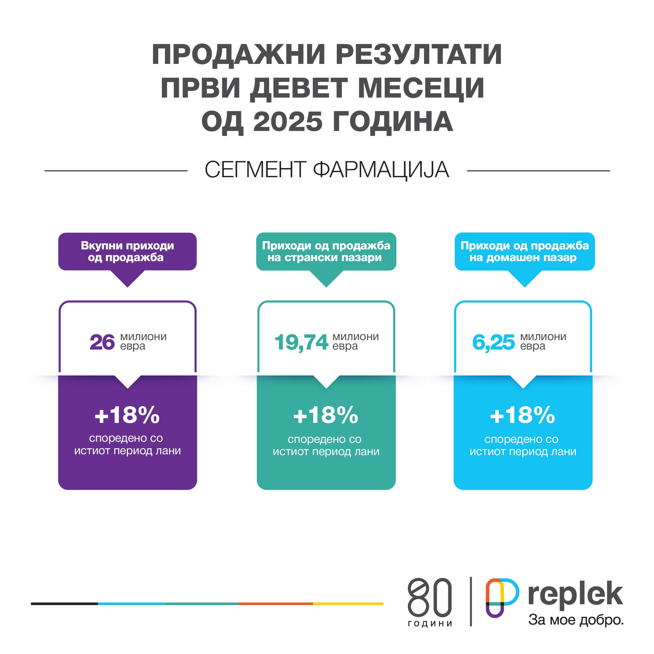Првите девет месеци од годинава „Реплек“ ги заврши со силен раст на приходите во сегментот Фармација од 18 % во однос на истиот период од минатата година. Компанијата континуирано инвестира во модернизација, дигитализација и проширување на пазарите, а во изминатиов период високите производни стандарди беа потврдени и со добивање на два EAEU GMP сертификати кои креираат дополнителни можности за проширување на пласманот на производите на 183-милионскиот пазар на Евроазиската економска унија.