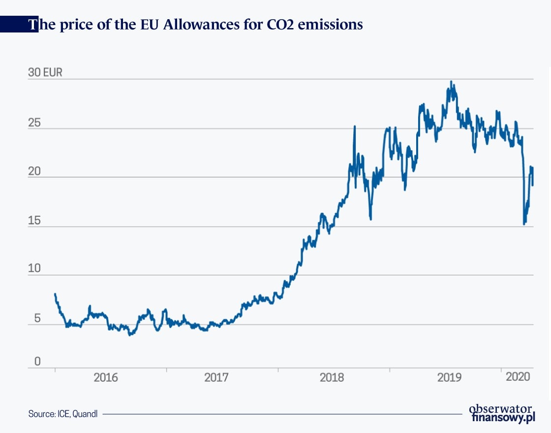 На графиконот погоре прикажано е движењето на цената на поединечен јаглероден кредит во рамките на Европската Унија. Опфатен е перод од 5 години (2015-2020 година), во кој јасно се гледа дека последните 2 години атрактивноста за овој инструмент е далеку поголема од периодот пред тоа. Цената на јаглеродните кредити во период од почетокот на 2015 година до крајот на 2017 година се движат од 5-10 ЕУР, додека во 2018 година цената драстично се зголемува за околу 250-300%, кога достигнува вредности од 25 ЕУР. Пикот се достигнува во 2019 година, кога цената на кредитот е 30 ЕУР, со тоа што оваа вредност многу кратко се одржува и во 2020 година бележи пад до ниво од 15 ЕУР по кредит.
