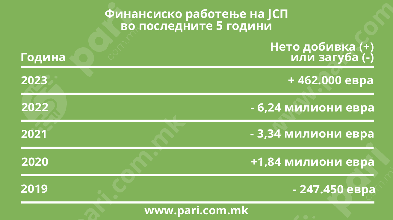 На официјалната страница на ЈСП, пак, може да се прочита последниот квартален извештај, а тој се однесува за првите три месеци од 2024 година. Во овој период ЈСП направило приход од 9 милиони евра, а расходите биле 8,8 милиони евра, со што за овие три месеци јавното претпријатие остварило позитивен резултат од околу 200.000 евра. Податоците покажуват дека годинава ЈСП има и поголеми приходи (за 8,5%) и поголеми расходи (за 24%) во однос на ланското прво тримесечје, со што и добивката му е помала за 82,2% во однос на истиот период во 2023 година кога е остварен плус од 1,2 милиони евра, но кој до крајот на годината се стопил во нето-добивка од 422.000 евра.