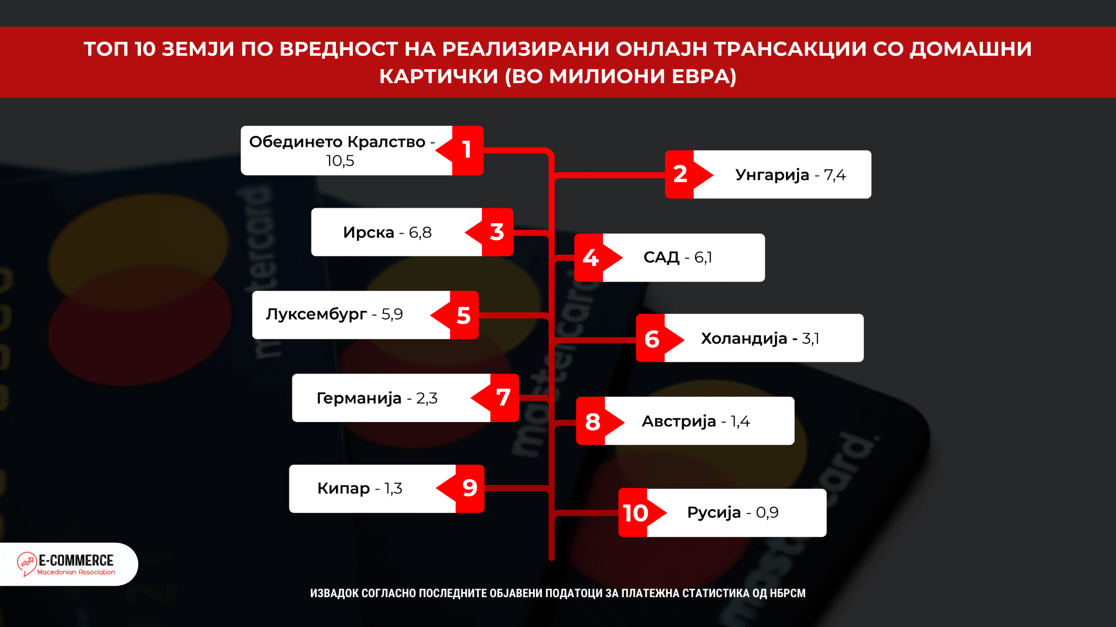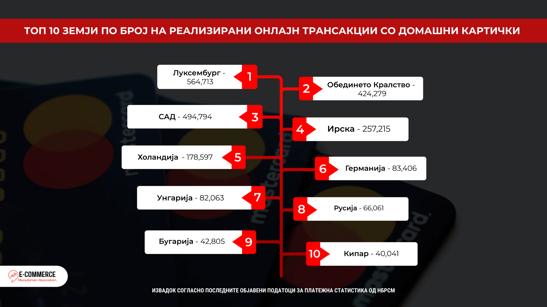 Што се однесува до бројот на онлајн трансакции со македонски платежни картички во странство, високи 80,6% од трансакциите завршиле во корист на ТОП 10 земјите прикажани во табелата во продолжение. Најголем број на трансакции со домашни платежни картички (вкупно 547.713) се реализирани во корист на веб продавници од Луксембург каде што е регистрирана европската филијала на Amazon преку која се одвиваат трансакциите за најголемиот дел од Европските земји, без Обединето Кралство.