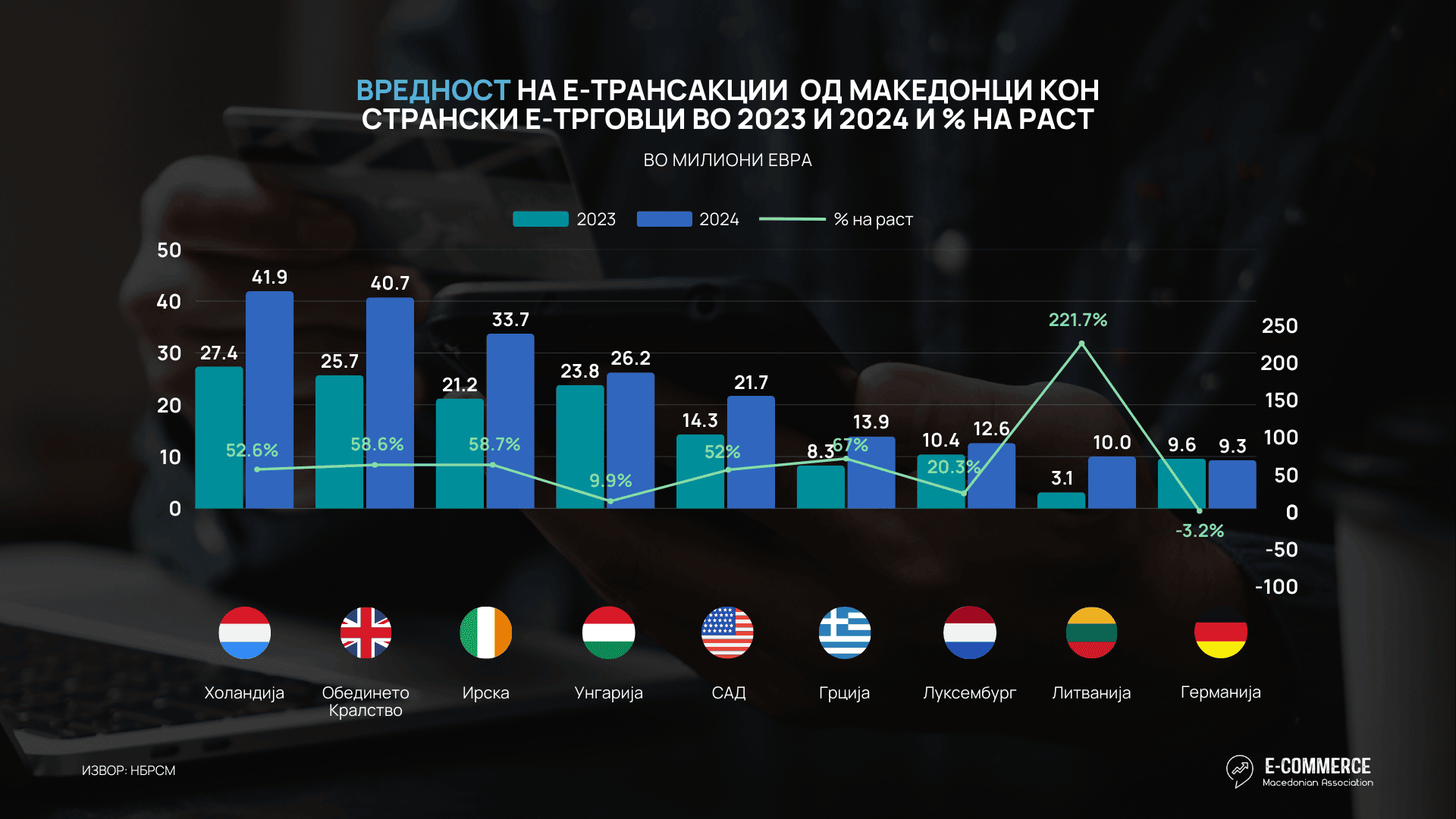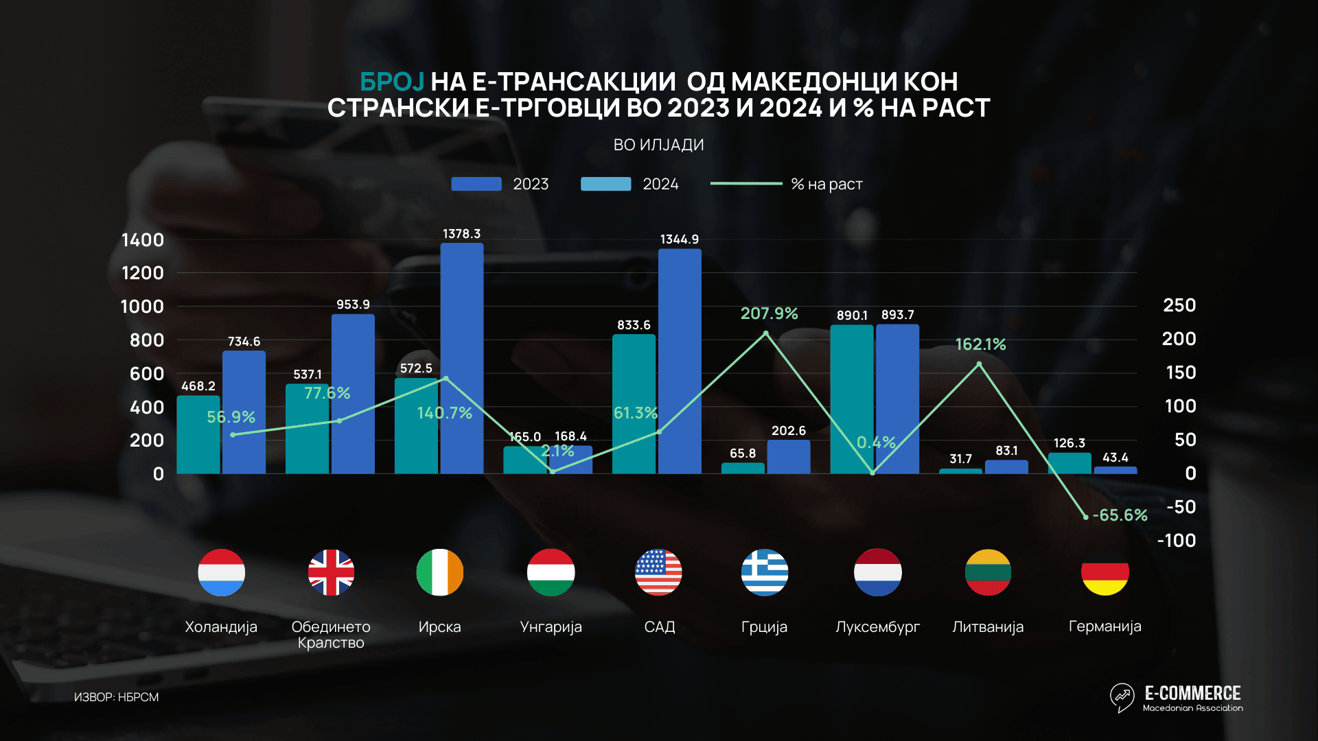 „Растот остварен во 2024 година во однос на минатата година изнесува 45.4% скоро ист пораст како и во 2022 година (46%) спрема претходната. Најмногу Македонците како и секоја година направиле трансакции кон Холандија во вредност од 41.9 мил. евра, Обединето Кралство 40.7 и Ирска 33.7 мил. евра. Истото е очекувано ако се има предвид дека од овие земји имаат седиште Booking.com, Netflix и Uber за Европа (Холандија), ASOS, Amazon UK(Обединето Кралство), додека највисокиот остварен број на трансакции од Македонци во Ирска, како и пораст на вредноста од 58.7% во однос на минатата година се должи на тоа што таму сe регистрирани, Meta и Google. Онлајн купувањето кон странски платформи, без разлика дали е тоа за производи или за резеравции во хотели, авиони или социјални медиуми, може да влијае позитивно и за домашните е-трговци со оглед дека се работи за менување на навиките и зголемено користење на онлјан купување воопшто. Од друга страна зголемената побарувачка ќе ги стимулира домашните трговци да ја зголемуваат и унапредуваат понудата и целокупното онлајн искуството за купувачите” – вели претседателката на Асоцијацијата за е-трговија на Македонија, Д-р Нина Ангеловска.