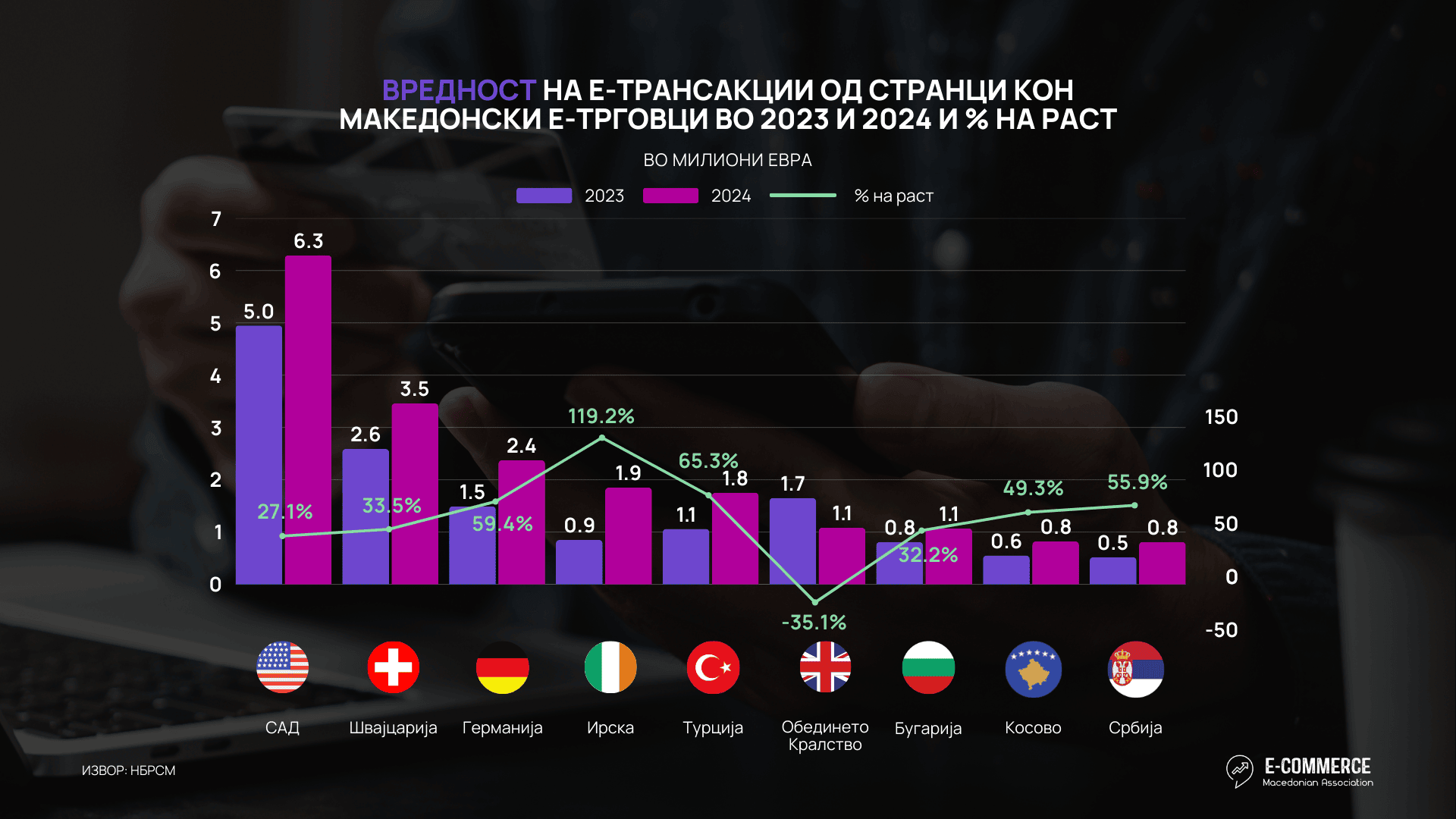 Согласно објавените податоци од НБРСМ, странски иматели на платежни картички за купување производи и услуги од македонски е-трговци во 2024 година потрошиле 37.2 милиони евра, што во однос на минатата година претставува пораст од 38.7%. Остварената вредност која странските онлајн купувачи ја направиле кон домашните е-трговци во 1.2 милиони трансакции бележи пораст од 44% во однос на 2023 година. Од вредноста на вкупно направените трансакции од странци кон македонски е-трговци во 2024 година 52.6% припаѓаат на иматели на платежни картички од 9 земји.  6.3 милиони евра или 17% од вредноста на трансакциите се направени од иматели на платежни картички издадени во САД, потоа 3.5 милиони евра од Швајцарија и 2.4 милиони евра од Германија. Потоа следат Ирска со 1.85 мил. евра, Турција 1.75 мил. евра и соседите Косово и Србија со 821 и 814 илјади евра. Најголем пораст и на вредноста и на бројот на трансакциите е остварен од ирските иматели на платежни картички, на сметка на намалување на вредноста и бројот на имателите на платежни картички од Обединетото Кралство.