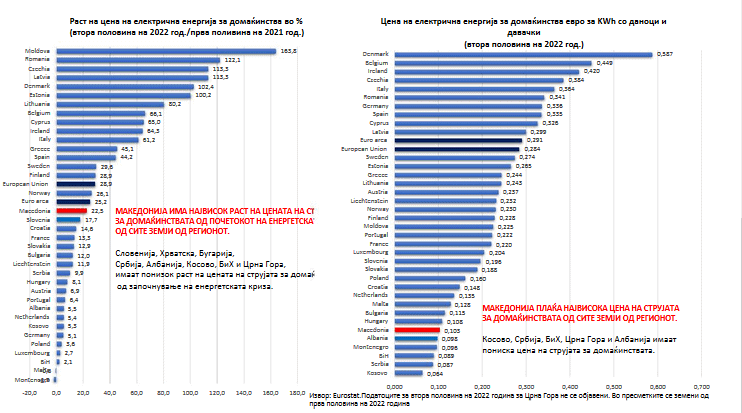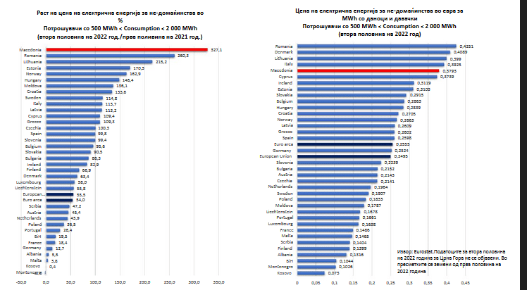 Фалбите на Владата за успешно справување со енергетската криза вчера беа целосно демантирани од објавените податоци на Евростат за цената на електричната енергија во втората половина од 2022 година кај земјите од Европа. Истите покажуваат дека во Македонија цената на електричната енергија за потрошувачите не-домаќинства (фирми и останати потрошувачи) има најголем раст во цела Европа од почетокот на енергетската криза. Фирмите плаќаат петта најскапа струја во цела Европа. Воедно, домаќинствата плаќаат најскапа струја од сите земји во регионот, а цената на стујата за домаќинствата во Македонија (и покрај фалбите за субвенционирање) забележа највисок раст од сите земји во регионот.