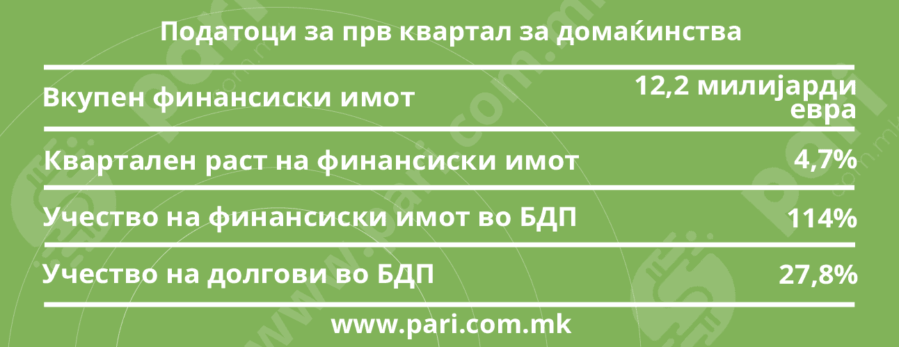 Вкупниот финансиски имот на домаќинствата во земјава на крајот од првиот квартал годинава изнесува 752,7 милијарди денари, што е рамно на 84% од македонскиот бруто домашен производ. Во првите три месеци граѓаните го зголемиле своето богатство за 34,1 милијарда денари. Тоа е квартален раст од 4,7%, објави Народната банка на Република Македонија. Финансиските средства ги зголемиле за 30,1 милијарда денари, а обврските ги намалиле за четири милијарди денари. Финансиските средства со кои располагаат граѓаните се 114% од БДП, а нивниот долг само 27,8% од БДП.