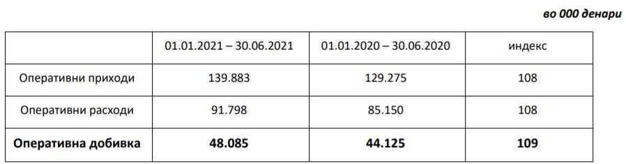 Остварените резултати од работењето за периодот Јануари – Јуни 2021 година, структурата, динамиката и споредбите со остварувањата во претходната година е прикажана во следната табела: