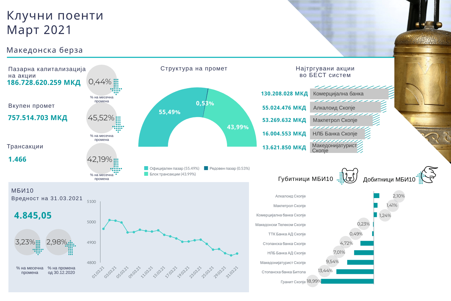 Според податоците кои ги објави Македонскта берза за периодот 01.03 – 31.03.2021 година вкупниот промет изнесувал 757.514.703 денари што претставува намалување за 45,52 отсто во однос на претходниот месец.