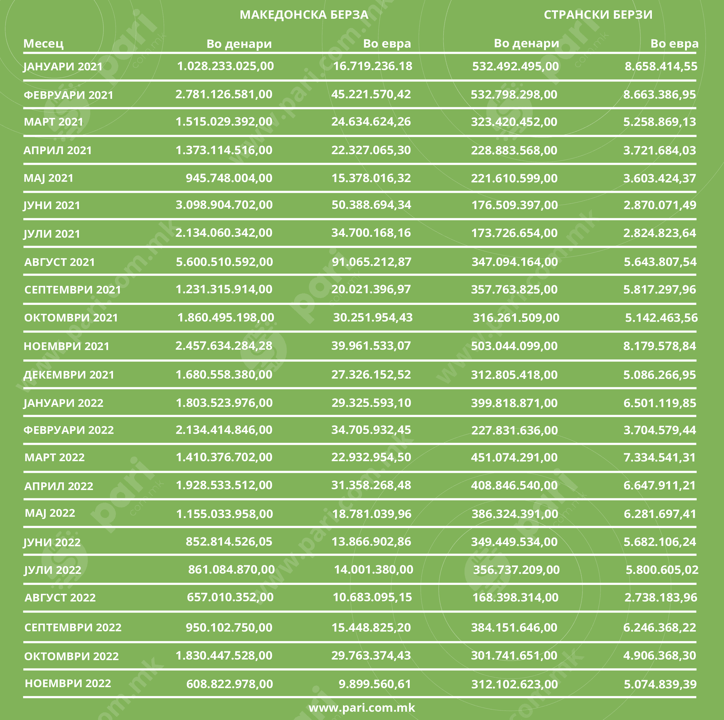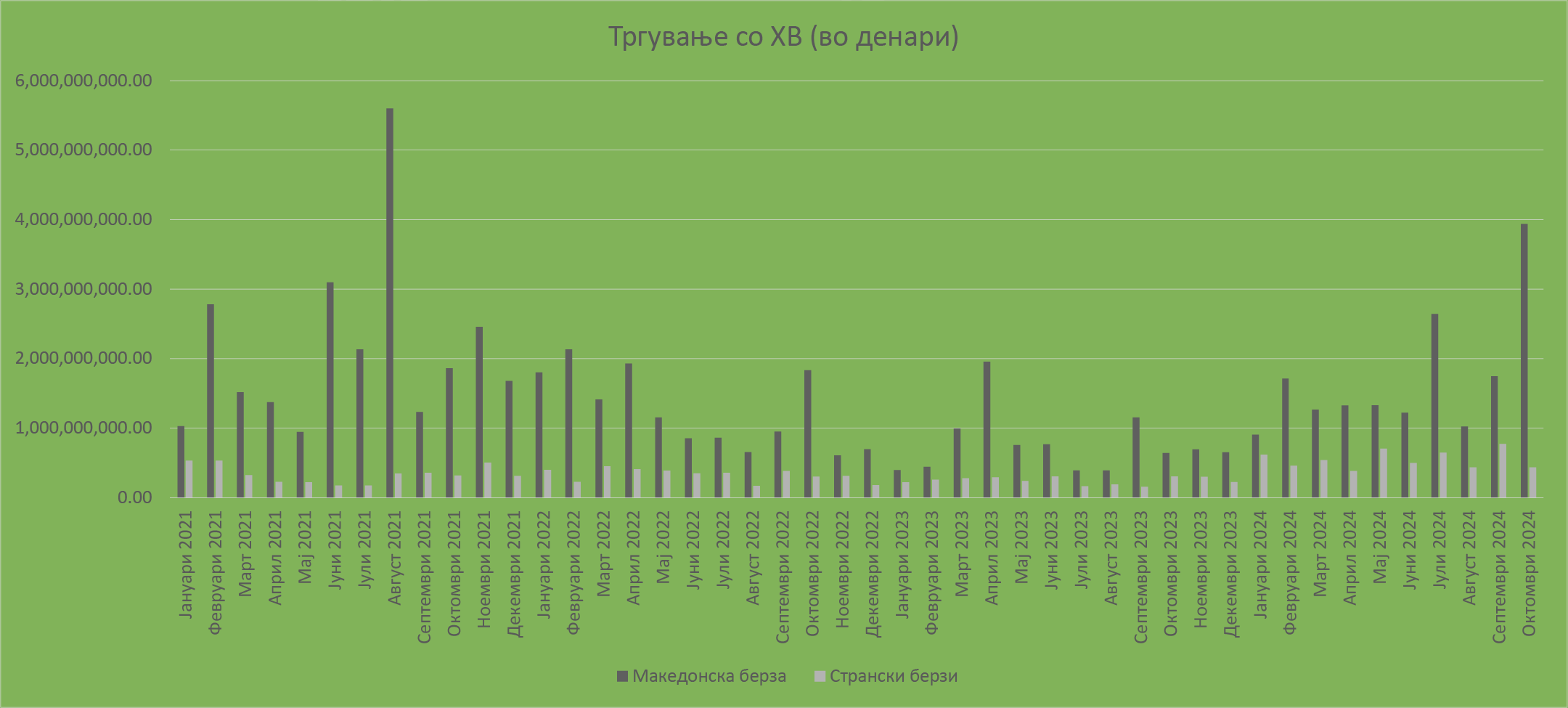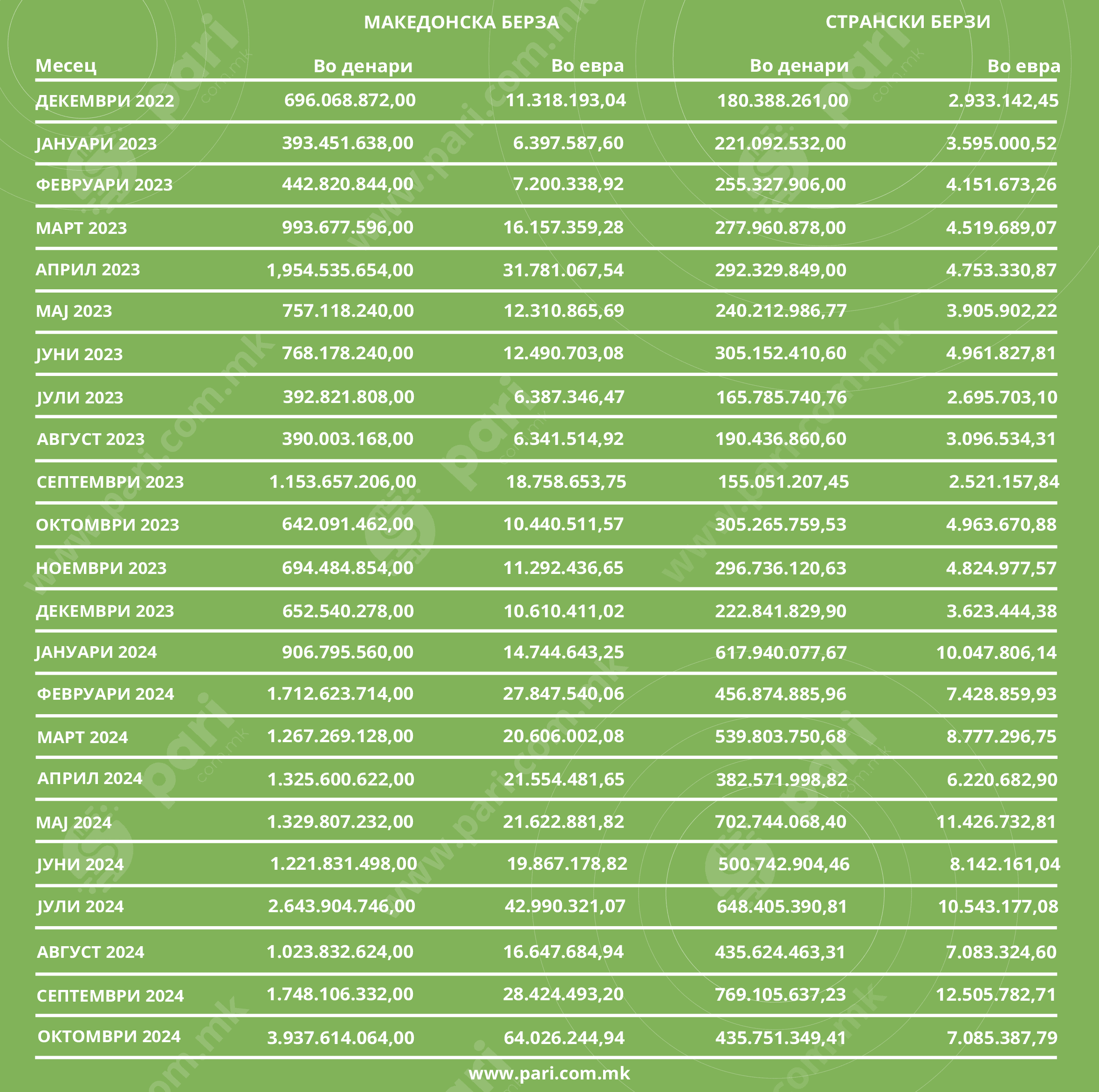 Податоците на Комисијата за хартии од вредност, врз кои се заснова анализата на Пари, покажуваат дека во првите десет месеци од 2024 година на странските пазари се истргувани хартии од вредност во рекорден износ од 89 милиони евра. Ова се официјалните бројки за тргување во странство што ги регистрира КХВ врз основа на податоците од овластените посредници, четири банки ‒ Шпаркасе банка, Комерцијална банка, НЛБ банка, Стопанска банка – Скопје и брокерската куќа Инвестброкер.