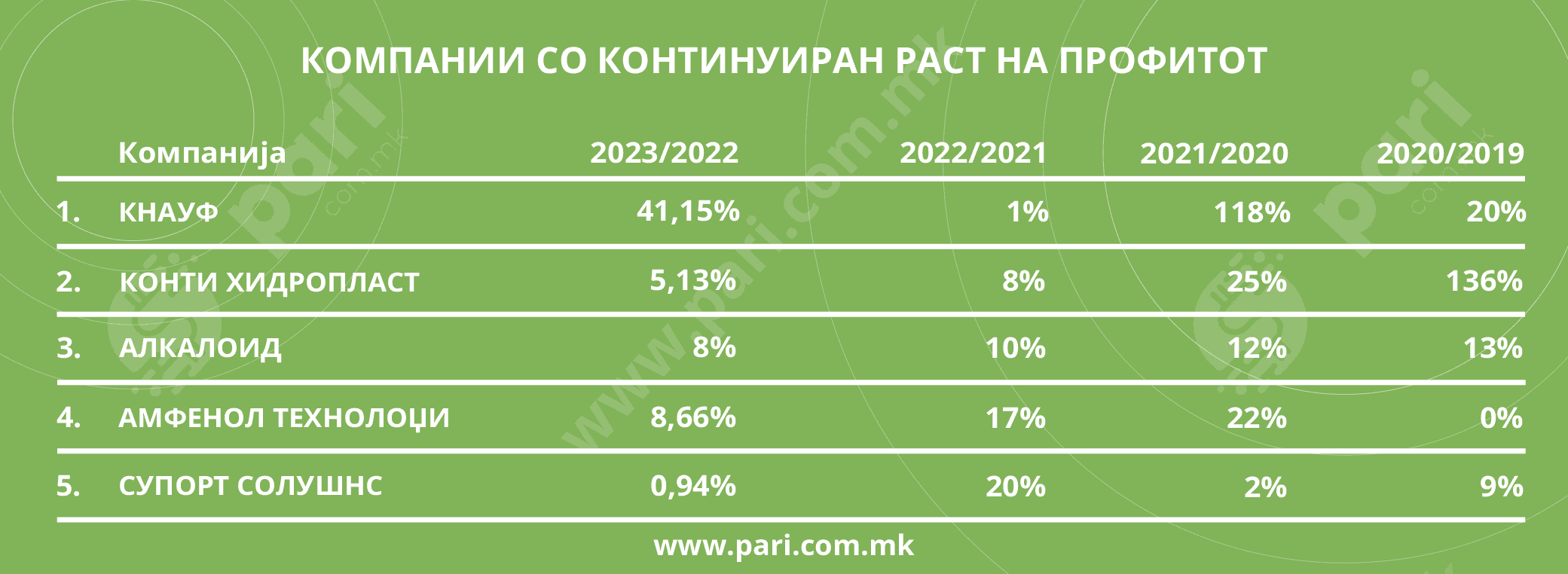 Анализирајќи ги податоците што во изминатите четири години ги објави порталот Пари заедно со платформата Бизнис мрежа, дојдовме до заклучок дека само 5 компании во Македонија имале постојан раст на профитот. Според висината на растот на добивката, на прво место е компанијата Кнауф, која во 2023 година го зголемила профитот за 41,15 насто, во 2022 година за 1 насто, во 2021 година за фантастични 118 насто, а во 2020 година за 20 насто.