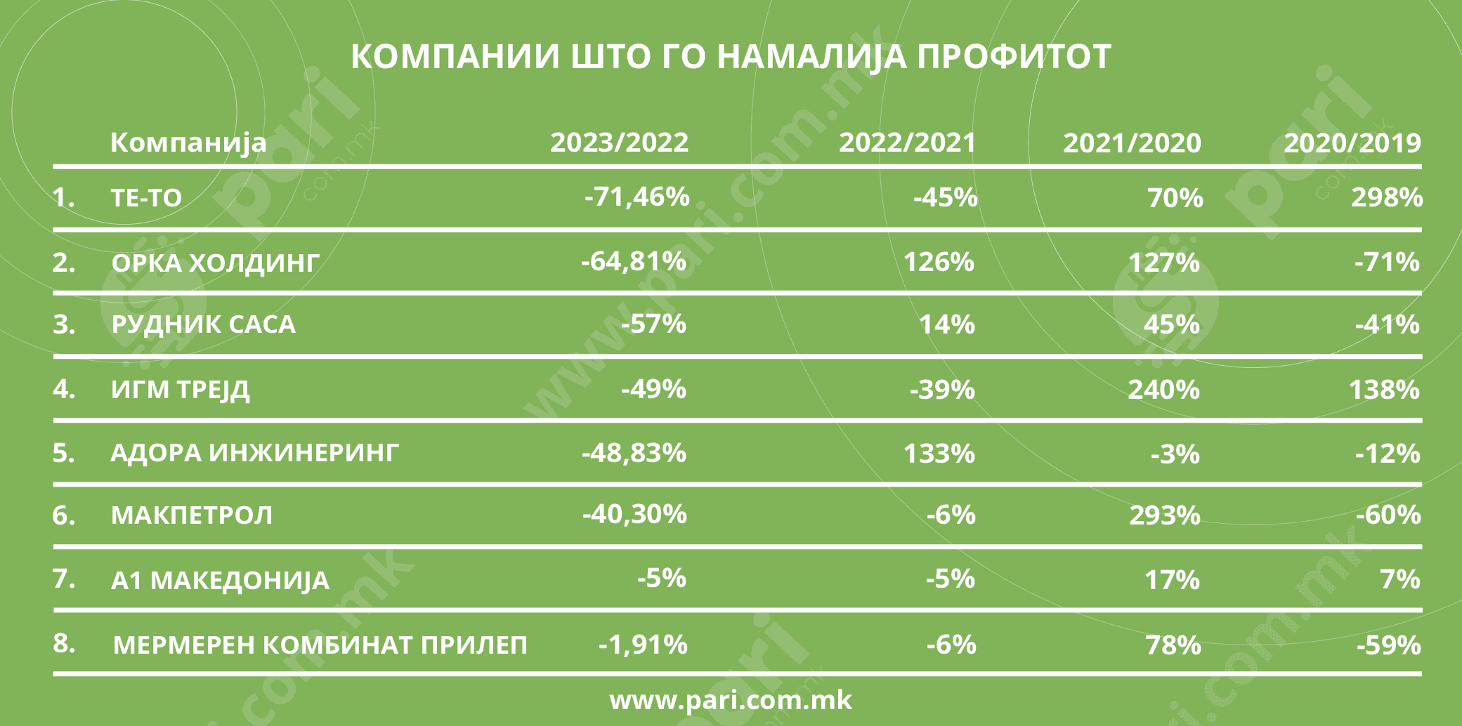 Некои компании во 2023 година, па и во претходниот период, бележат пад на добивката, како на пример: Те-то, Орка холдинг, Рудник Саса, ИГМ трејд, Адора инжинеринг, Макпетрол, А1 Македонија и Мермерен комбинат Прилеп.
