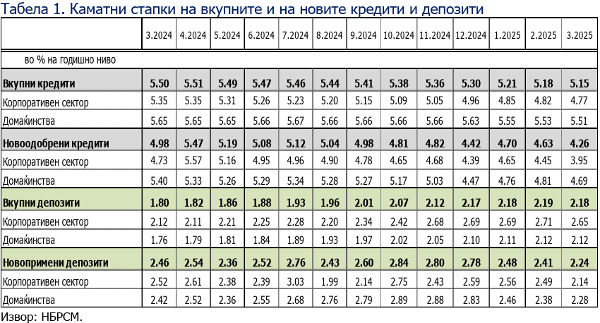 Поевтини кредити користат и компаниите. Во март просечната каматна стапка на вкупните кредити на корпоративниот сектор изнесува 4,77%. Пониска е за 0,05 п.п. на месечно ниво, додека годишниот пад е измерен со 0,58 п.п. „Месечната промена произлегува од падот на каматните стапки на денарските кредити со и без валутна клаузула (за 0,14 п.п. и 0,04 п.п., соодветно) и на каматните стапки на кредитите во странска валута (за 0,03 п.п.)“, образложуваат од НБРМ.