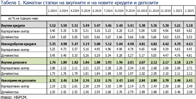 Пад од 0,07 проценти месечно и 0,72 процентни поени годишно е реегистриран и кај просечната стапка на новоодобрените кредити. Каматата за нив е 4,63 проценти. И кај новите депозити има месечно намалување на стапката за 0,07 п.п., а годишното позитивно поместување е за 0,10 п.п. Оттаму и просечната стапка во февруари од 2,41 процент.