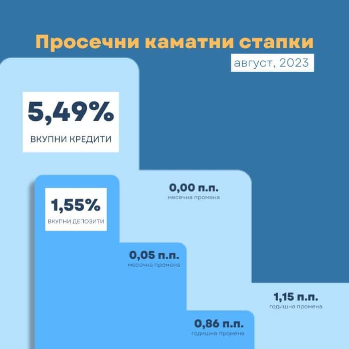 Сепак, најновите податоци на Народната банка покажуваат дека и покрај месечната стагнација, просечната каматна стапка на вкупните кредити на годишна основа е зголемена за 1,15 процентни поени. Во август е забележано и дека просечната стапка на новоодобрените кредити има месечно намалување од 0,04 п.п. и изнесува 5,53 проценти, а на годишно ниво е со раст од 1,49 п.п.