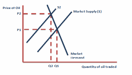 На графиконот е прикажана состојба кога земјите членки на OPEC преку најразлични договори и спогодби ја ограничуваат понудата на енергенси на пазарот, преку намалено производство (поместување од Q1 кон Q2) и предизвикуваат придвижување на кривата на понудата кон состојба S2. Таквата ситуација, проследена со константна побарувачка, води кон остварување на повисоко ценовно ниво, во точката P2.