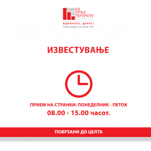 КБ Прво пензиско друштво, согласно последните измени на работното време од 04ти мај приемот на странки го врши во временски интервал од 08.00 до 15.00 часот, секој работен ден од понеделник до петок.