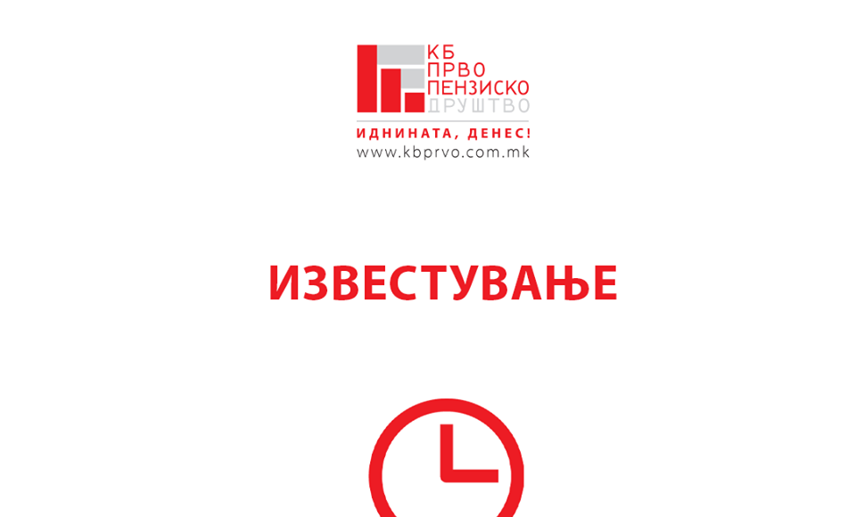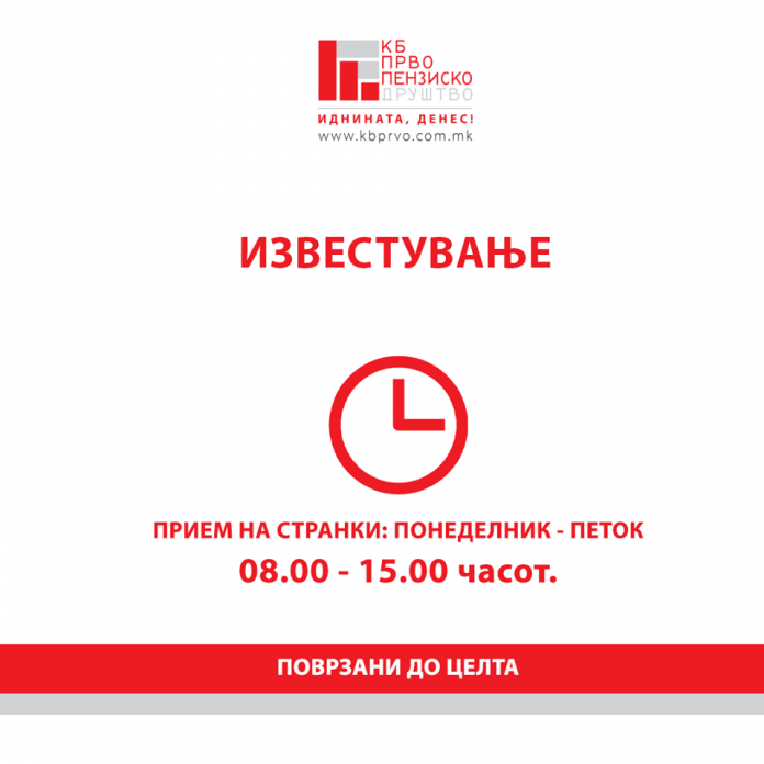 КБ Прво пензиско друштво, согласно последните измени на работното време од 04ти мај приемот на странки го врши во временски интервал од 08.00 до 15.00 часот, секој работен ден од понеделник до петок.