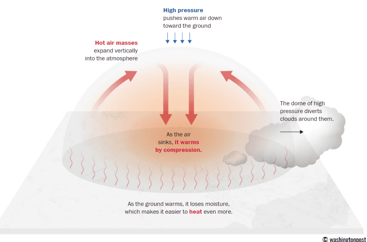 Топлинската купола работи како капак на тенџере. Широката купола на топлина заробува значително потопла воздушна маса на сите нивоа одоздола, потопувајќи ги нејзините слоеви кон земјата. Поради тоа, воздушната маса станува сува и значително се загрева додека ги достигнува најниските височини.