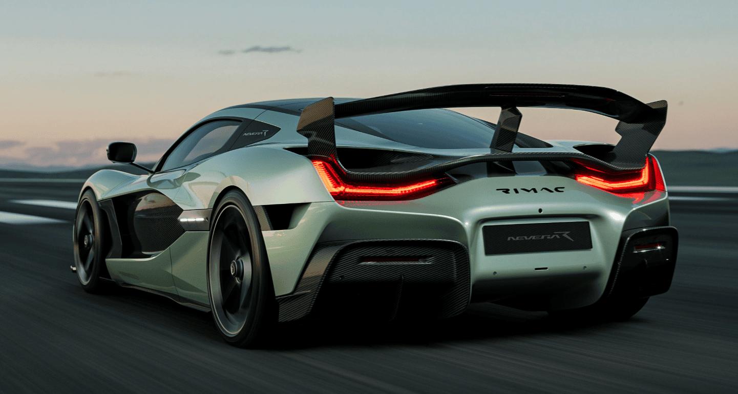 Новото елегантно решение за тркалата се истакнува со подолгите краци за да се нагласи нивната големина и јасната поделба на боите. Големото фиксирано задно крило во комбинација со агресивни аеродинамични елементи, кои вклучуваат нов голем дифузор, ја зголемува надолната сила за 15 проценти и аеродинамичката ефикасност за 10 проценти во споредба со Never. Благодарение на новите гуми Michelin Cup 2, целокупното потуправување е намалено за 10 отсто, страничното зафат е зголемено за 5 отсто, а времето на кругот на тест патеката Нардо е намалено за 3,8 секунди. Со таква комбинација на негативна странична камерност, посилно држење на новите гуми и дополнителна надолна сила, Nevera R може да им пркоси на законите на физиката како никогаш досега. Секој елемент од автомобилот, направен во согласност со дизајнерската филозофија ориентирана кон перформанси, е дизајниран да резултира со агилност и поголемо управување.