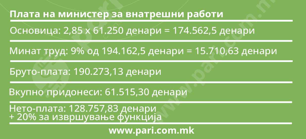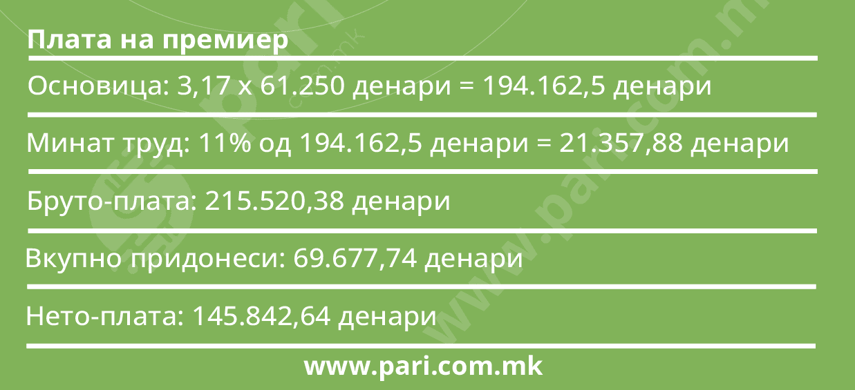 Со тоа, на пример, платата на премиерот, од сегашните 140.450, по ново би била 145.842,64 денари. Ова е нето-износ. Производот од коефицинетот и просечната бруто-плата дава сума од 195.018 денари. Христијан Мицкоски има работен стаж од 22 години (секоја година минат труд значи и половина процент плус), па тие 11 проценти носат дополнителни 21.452 денари. Значи, основната премиерска бруто плата ќе треба да е 216.470 денари или нешто повеќе од 3.500 евра. Овој бруто износ се намалува за 32,33 проценти колку што се издвојуваат за плаќање на придонесите, односно на оваа сума, минус 69.677,74 денари, а нето-платата на премиерот ќе биде 145.842,64 денари.