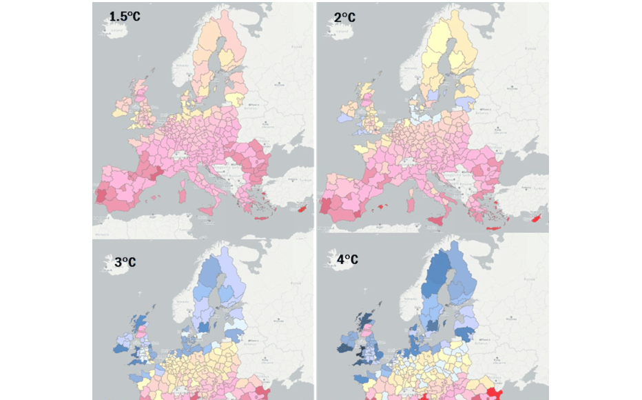 Во клима со затоплување од 1,5°C, поголемиот дел (80%) од европските региони се предвидува дека ќе бидат погодени од климатските промени само во прилично мал дел, при што протокот на туристи кои ги посетуваат тие региони варира помеѓу -1% и +1%. Резултатите се прилично слични за сценариото за затоплување од 2°C.