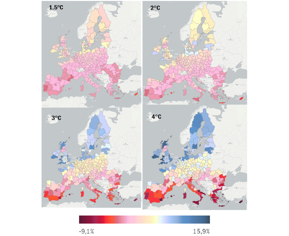 Дополнително, најголемите загуби – повеќе од 5% – се проектирани низ регионите на Кипар, Грција, Шпанија, Италија и Португалија, додека најголемите добивки – над 5% – се распределени низ Германија, Данска, Финска, Франција, Ирска, Холандија, Шведска и Обединетото Кралство.
